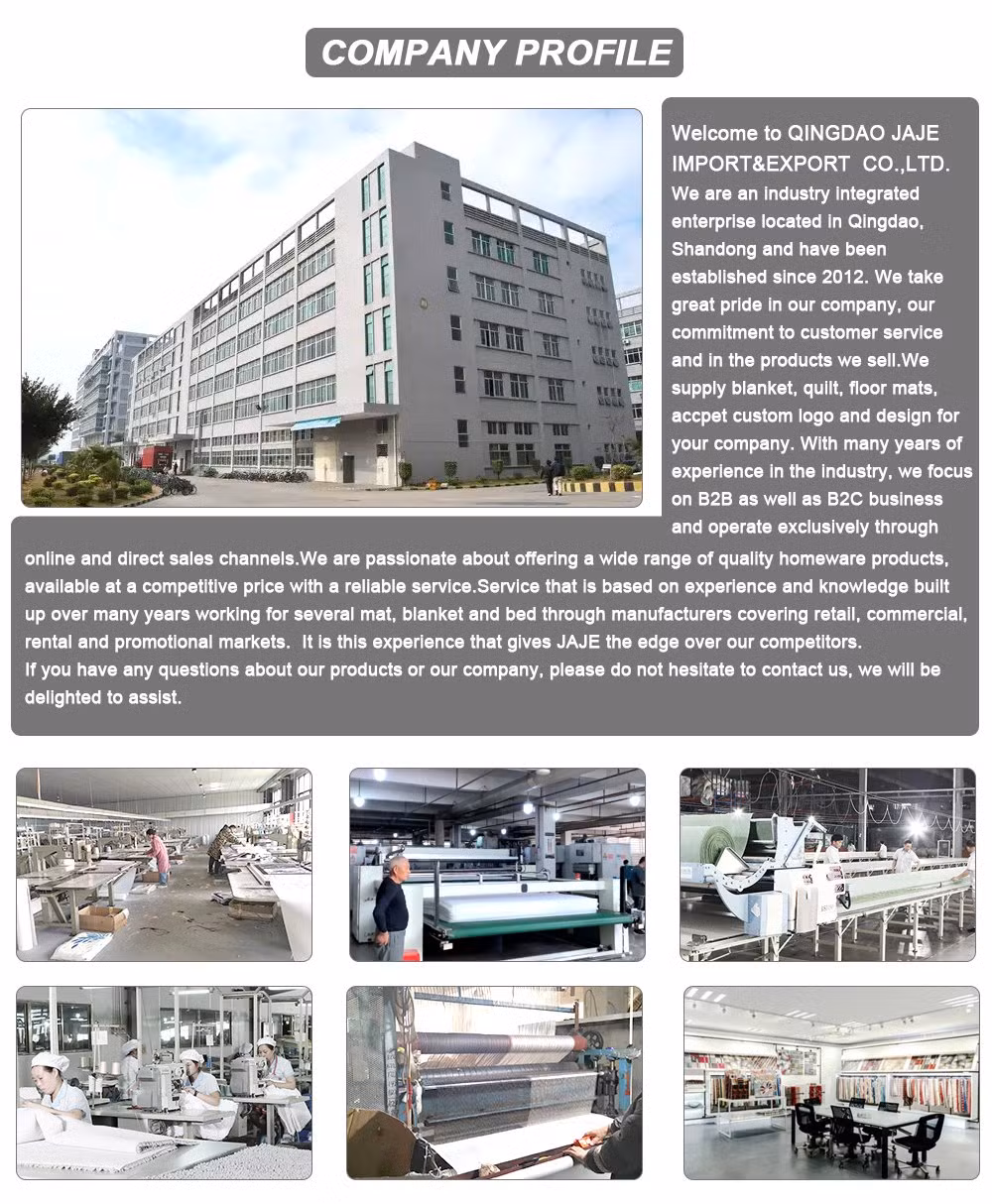 Somos una empresa integrada en la industria ubicada en Qingdao, Shandong y se ha establecido desde 2012. Nos sentimos muy orgullosos de nuestra empresa, nuestro compromiso con el servicio al cliente y los productos que vendemos. Suministramos manta, colcha, alfombrillas, logo personalizado accpet y diseño para su empresa. Con muchos años de experiencia en la industria, nos centramos en B2B y B2C negocios y operamos exclusivamente a través de canales de venta directa y online.